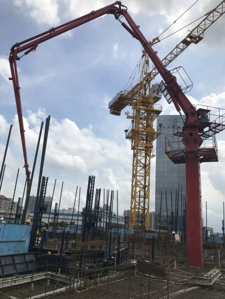 布料機(jī)安裝在核心筒預(yù)留孔內(nèi),隨樓層施工逐層爬升,不占用樓板施工面,避免與常規(guī)布料機(jī)一樣壓迫樓板,有利于對樓板鋼筋保護(hù)層及控制鋁模變形。